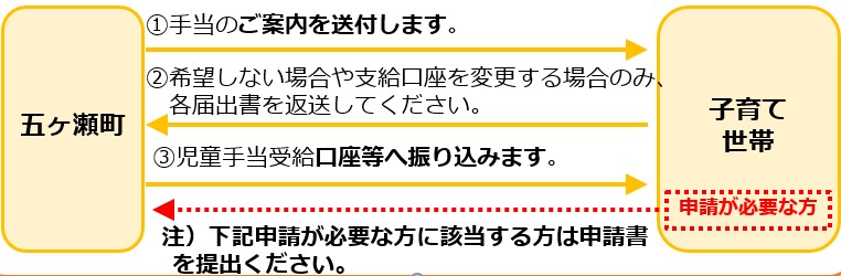 五ヶ瀬町から、令和7年9月分(令和7年9月に出生した児童については10月分)の児童手当が支給された方は申請不要です。(プッシュ型支給)