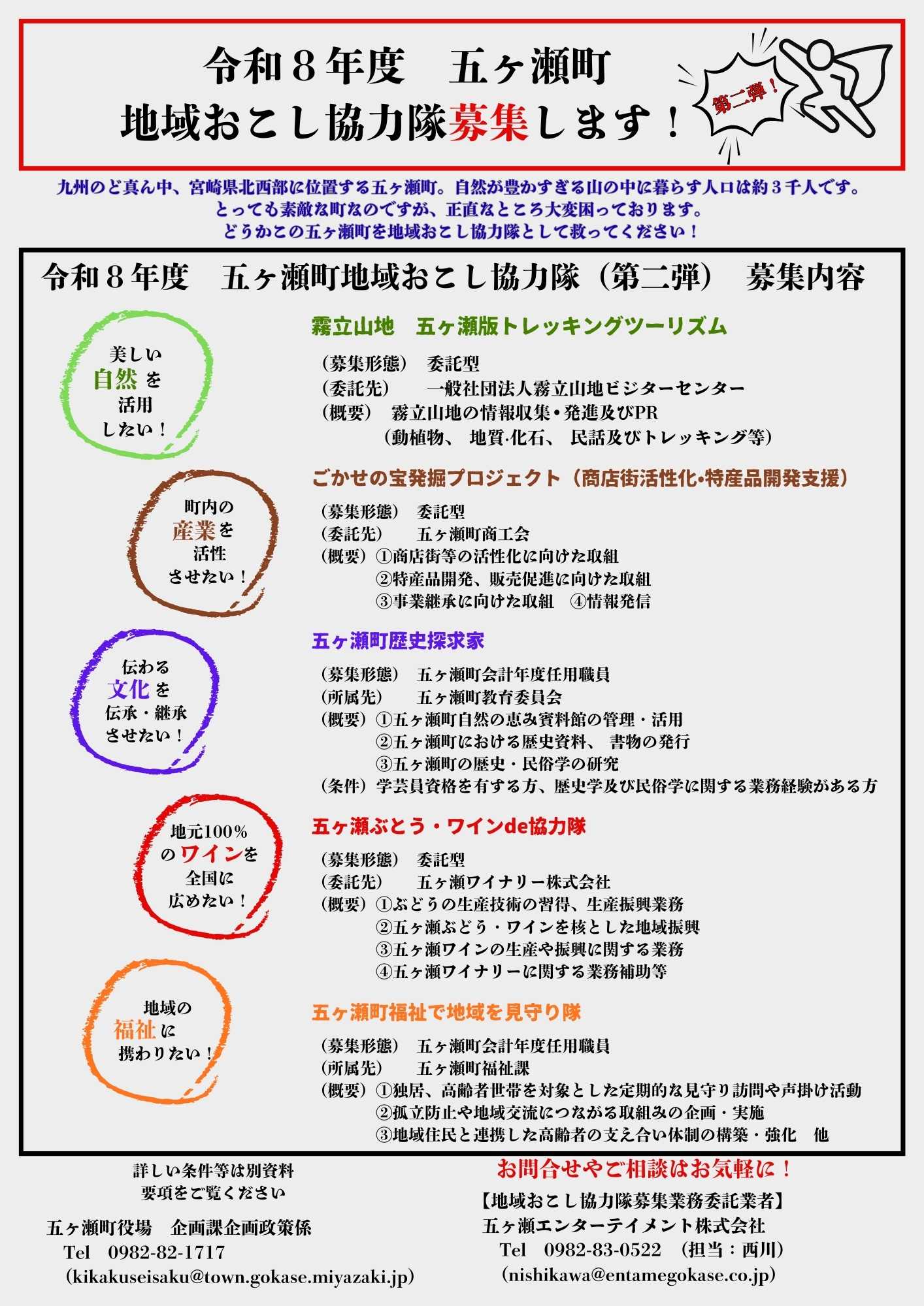 ※ 「3. 五ヶ瀬町歴史探求家」については、学芸員資格を有する方、または歴史学及び民俗学に関する業務経験がある方を募集します。
